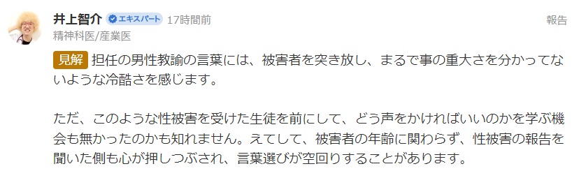 ただ、このような性被害を受けた生徒を前にして、どう声をかければいいのかを学ぶ機会も無かったのかも知れません。えてして、被害者の年齢に関わらず、性被害の報告を聞いた側も心が押しつぶされ、言葉選びが空回りすることがあります。