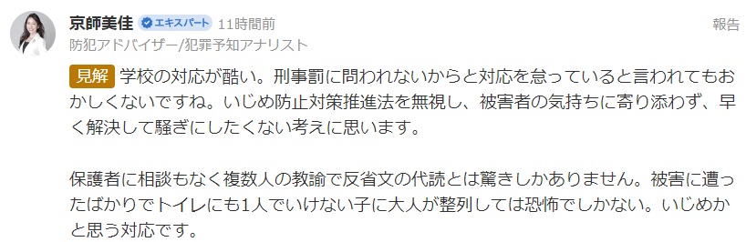 学校の対応が酷い。刑事罰に問われないからと対応を怠っていると言われてもおかしくないですね。いじめ防止対策推進法を無視し、被害者の気持ちに寄り添わず、早く解決して騒ぎにしたくない考えに思います。
